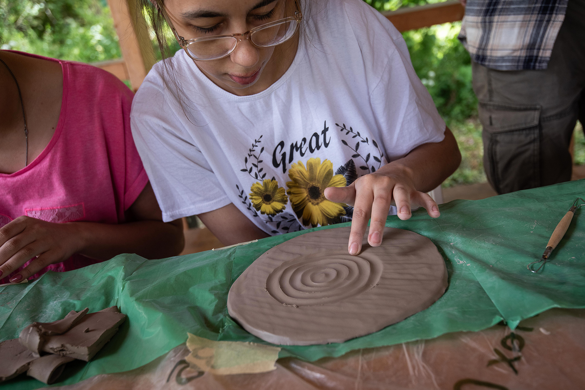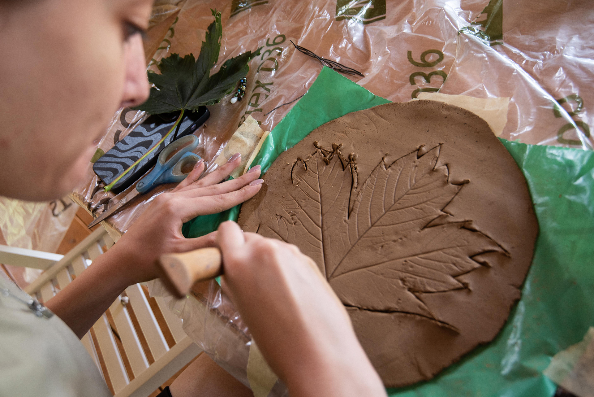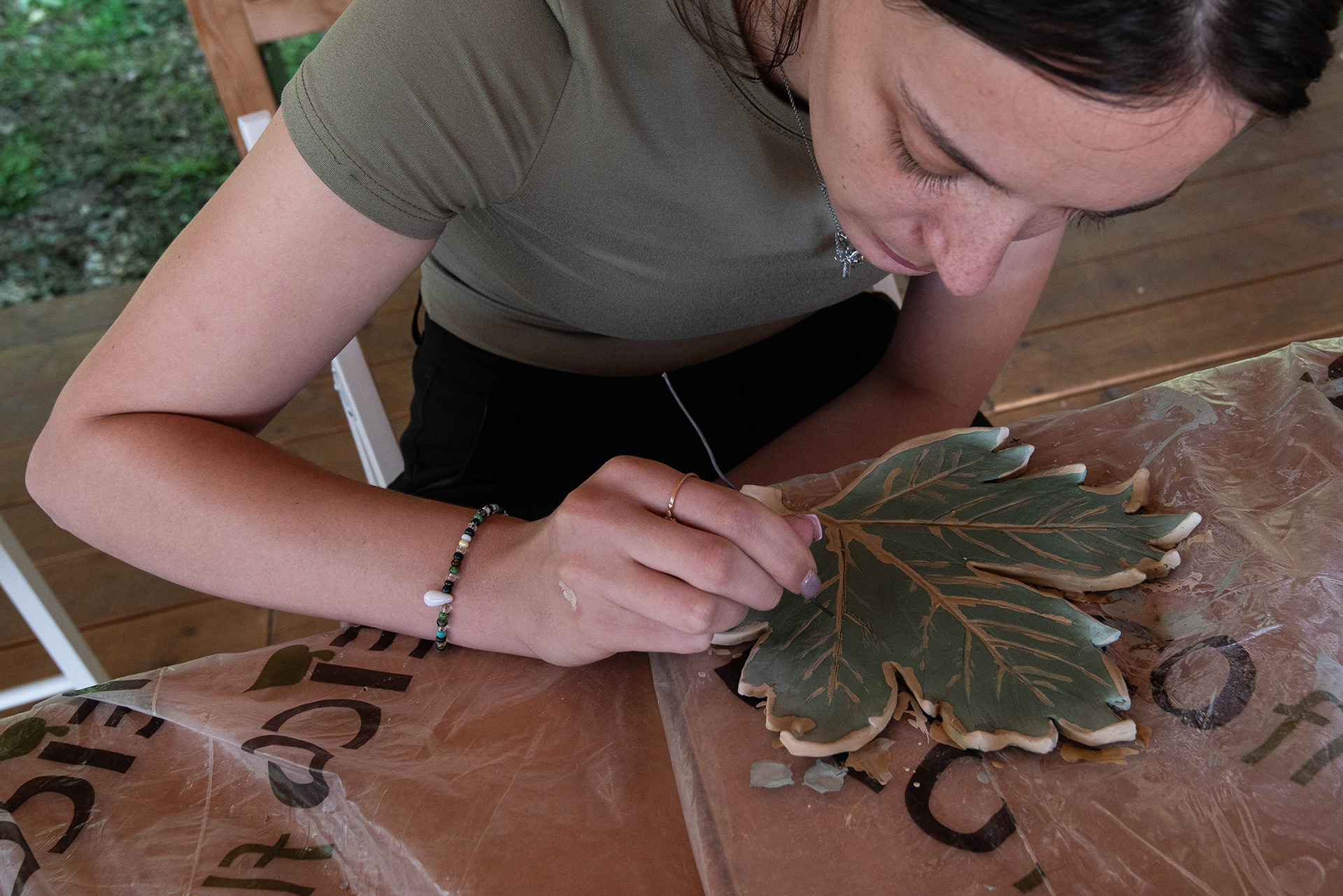 Using leaves and natural materials, participants created detailed imprints in clay — capturing organic textures and transforming them into relief compositions. This connection to nature became a central visual theme of the workshop.