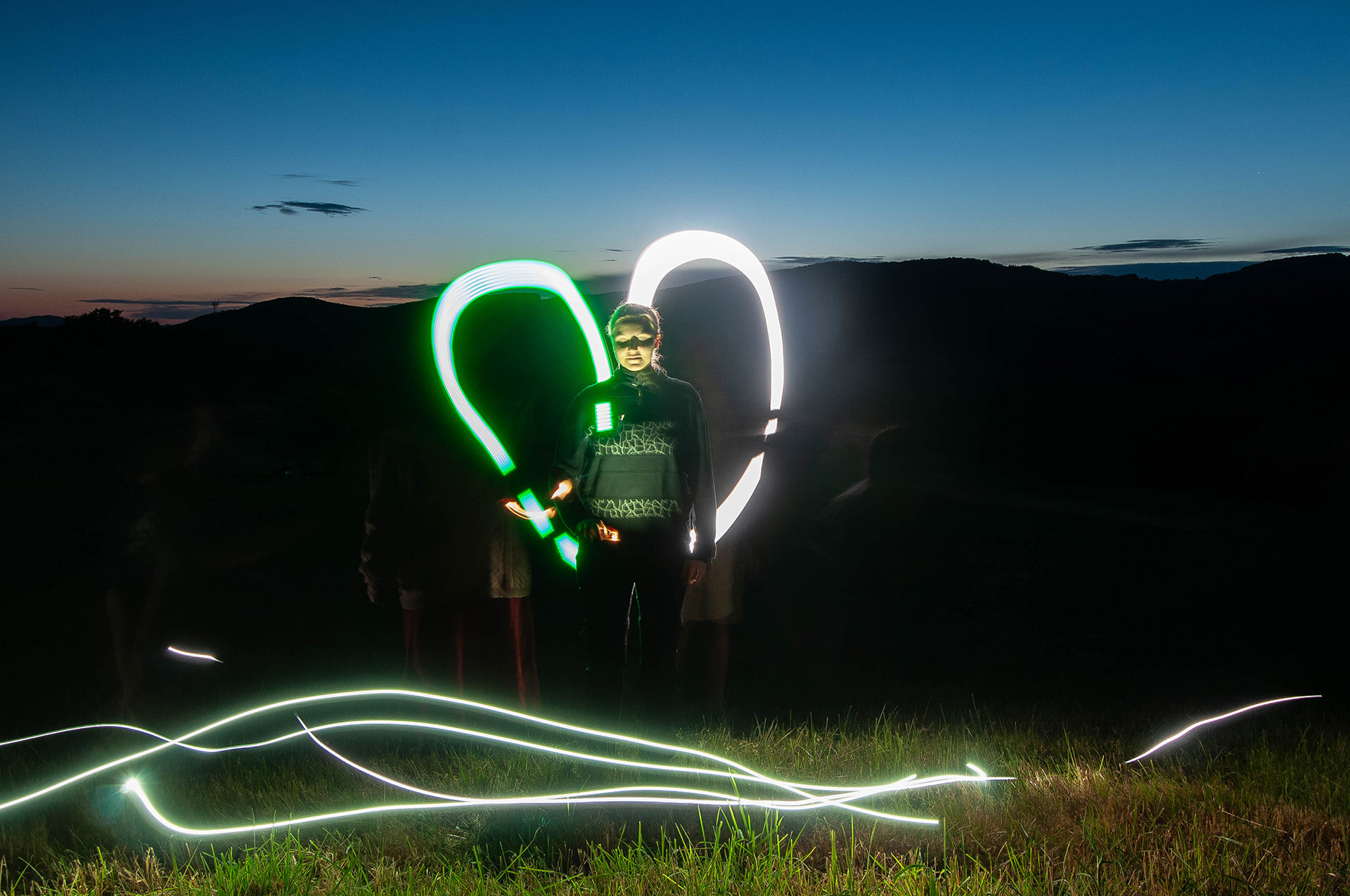 ✨ Series of Luminographic Works: A striking collection of night images where light traces figures, spirals, wings, and abstract forms against the darkening Zaježová landscape.